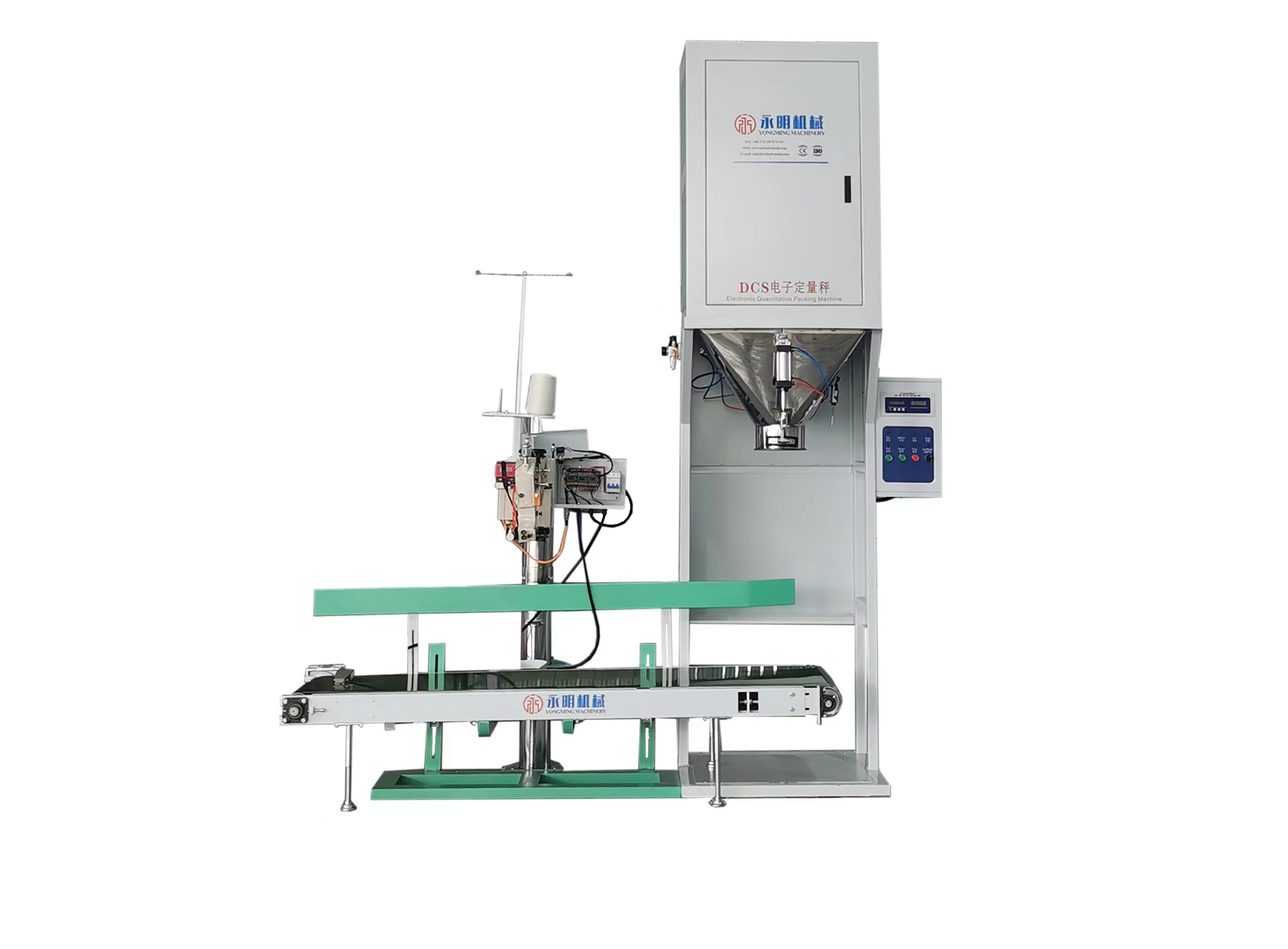 電子定量秤是可以實(shí)現(xiàn)自由定量、自動(dòng)稱(chēng)重、自動(dòng)打包的設(shè)備。物料由進(jìn)料口進(jìn)入料箱內(nèi)部進(jìn)行稱(chēng)重,當(dāng)物料達(dá)到設(shè)定重量后關(guān)閉進(jìn)料口,控制系統(tǒng)接收到已套袋信號(hào)后,卸料口打開(kāi)使料箱內(nèi)物料流入袋中;待料箱內(nèi)物料全部進(jìn)入包裝袋中后,控制系統(tǒng)打開(kāi)氣動(dòng)閥門(mén),使包裝袋進(jìn)入輸送系統(tǒng)并運(yùn)行至自動(dòng)縫包機(jī)進(jìn)行縫包。該設(shè)備每小時(shí)可打包450-500件貨物,可以有效降低人工成本并準(zhǔn)確的控制包裝精度。